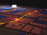 | これは、マンション建設時の展示場用模型の例です。 マンションの模型っていっても、周辺地域の説明用にかなり大きな範囲で作ってあり、メインの建物をライトアップして表現したりと、とても凝ったステキな模型でした。 ここでは、ELファイバが路線役で大活躍!色数豊富なので、例えば、山手線は『グリーン』の様に路線のイメージカラーに合わせたELが使用されました。しかも、スイッチ切り替えで各路線をバラバラに光らせることもできたので、マンションの近くに何線が走っているかが一目瞭然!大好評でした。 2002.4.2 |