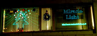 | これは、事務所ビルの窓にELでX'masデコレーションをした例です。 シートもファイバも軽いので、好きな形を作ってテープで窓に貼り付けています。ファイバーは、切らずに一筆書きの要領でツリーや文字をデザインしているので、X'masの次はお正月バージョンなど、再利用可能になっています。ELシートでは、会社URLを作って外へ向けてアピール!駅のホームから見えるビルだったので、宣伝効果に一役かいました。 光るリースは、3本のファイバーが順番に光るシーケンスタイプのインバータを使用。リースの縁取りが1本ずつキラキラと光ります。ちなみに、同じ使い方をすれば、床屋さんマークの赤と青のクルクルも作れますよ。光+点滅で、注目度更にUPです。 手軽な装飾でお店のPR効果絶大!大きな窓のお店をお持ちの店長さん、いかがですか? 2002.12.13 |